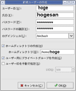 | 5 ユーザー登録 2005/06 インストール時に最低root(スーパーユーザー)はパスワードの指定で 登録されますのでシステム管理者はこのパスワードでログイン出来ますが FTP,WEBユーザはこのままでは使用出来ません postfixのメールアドレスもこのユーザー名で使用します。 左下のスタートより「システム設定」→「ユーザーとグループ」をクリック ![]() 上記の画面が出ますので「ユーザーを追加」をクリックします。 すると下記の画面が出ます ユーザー名:hoge ←追加するユーザー名を入力 氏名:hogesan ←ユーザー名を入力 パスワード:******** ←パスワードを入力 パスワードの確認:******** ←同じパスワードを入力 この時ホームディレクトリの作成にチェックが入っていれば /home/hoge ←ここがFTP,WEBユーザーのディレクトリ /home/hogeのhomeは変更出来ますがWEB公開する場合は注意が必要 (httpd.confでhomeを指定しております) ユーザーID等は特に指定がなければ自動でかまいません。 間違いが無ければ「OK」をクリックします。 ![]() FTPでログインした場合は /home/hoge になります。 WEBユーザーの場合は下記を実行して下さい。 # cd /home/hoge # mkdir public_html ←ユーザーホームページ公開用ディレクトリ # chown hoge,hoge public_html このpublic_htmlにホームポージのデーターを転送して下さい。 ここでの公開は http://www.hogehoge.com/~hoge/ の時に 表示されるフォルダーを示します。 |